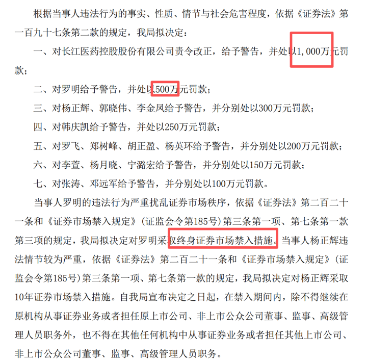 对此,监管部门拟对*ST长药罚款1000万元,对14名责任人合计罚款3100万元,对公司原总经理罗明采取终身证券市场禁入措施。